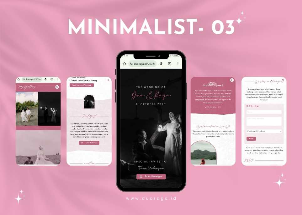 Desain undangan digital di duaraga.id sangat beragam. Kamu bisa memilih desain sesuai selera. FYI kami juga menyediakan custom desain.